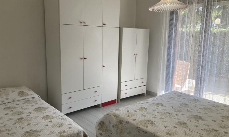 Type C: the apartment lies on the ground floor and consists in a living-dining room with sofa bed and cooking corner, 1 bedroom with 1 double bed and 1 single bed, 1 room with bunk bed, 1 bathroom with shower/WC, spacious enclosed patio with garden furnishings. For 5-6 people. TV - microwave oven - air conditioner - washing machine.