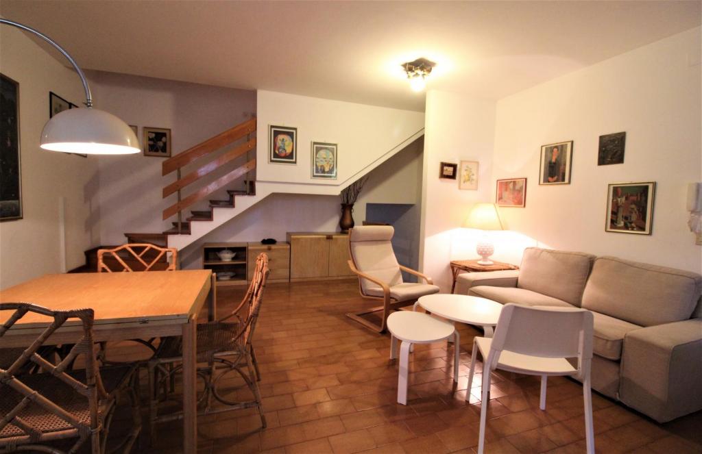 Type E1: on the garden level living-dining room, kitchen, 1 little bathroom, patio with garden furnishings and fireplace; on the raised level 1 double bedroom, 1 bedroom with two single beds, 1 bathroom with shower, balcony; on the first floor 1 double bedroom, 1 bathroom with tub, balcony; on the ground level 1 additional bed. For 6-7 people. Ideal for families with children - dishwasher - washing machine - microwave oven - TV - air conditioning unit.